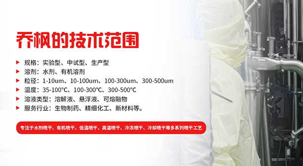 上海喬楓實業(yè)有限公司,成立于2012年,是從事噴霧干燥設備的研發(fā)設計、生產、銷售(小型噴霧干燥機實驗型噴霧干燥機35℃低溫噴霧干燥機有機溶劑噴霧干燥機低溫閉式循環(huán)噴霧干燥機超細粉末噴霧干燥機噴霧冷凍干燥機真空噴霧干燥機氣流噴霧干燥機噴霧造粒干燥機離心噴霧干燥機沸騰制粒機等)和售后于一體的綜合性公司,本公司現成為一家致力于為生物制藥、精細化工、新能源、陶瓷造粒及食品工程等領域提供全套解決方案的整線交鑰匙工程企業(yè)。